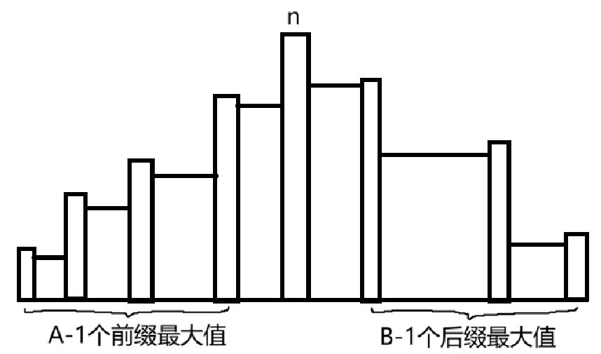 一个前缀最大值到它的下一个前缀最大值之间的数,一定小于这个前缀最大值。后缀最大值同理。因此我们将整个排列看做 $A+B-2$ 个环,每个环中的最大值作为一个前(后)缀最大值。从 $A+B-2$ 个环中选出 $A-1$ 个放在 $n$ 左边,剩下 $B-1$ 个放在 $n$ 右边。每个环内的最大值为关键字进行排序,即可确定唯一的顺序。因此最终答案为: